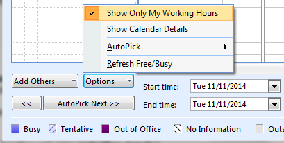 If you need to schedule a meeting earlier than 8am or later than 5pm, uncheck the same option to see the expanded hours. You can also type in the times under "Start time" and "End time", but doing so will automatically set it to show all hours of the day, and you will have to check "Show Only My Working Hours" again to shorten the hours again.