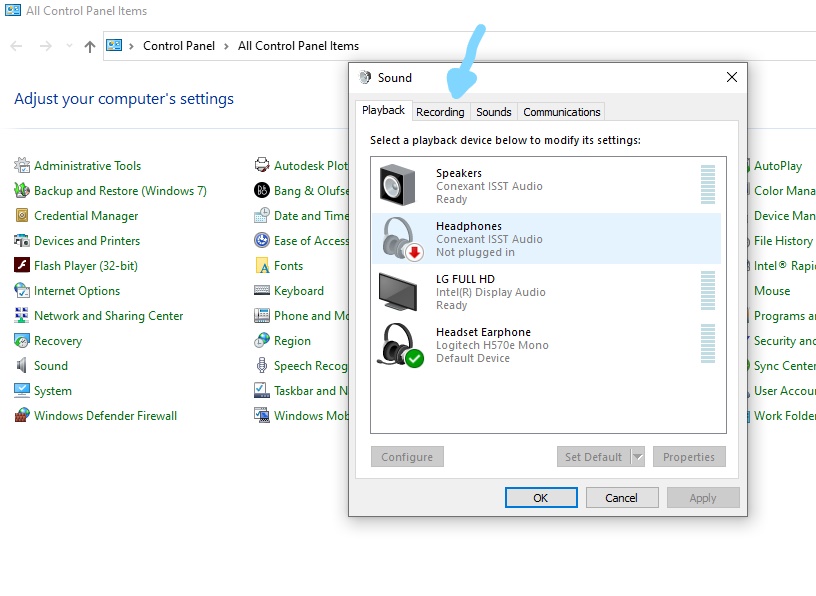 Click the recording tab on the sound app and right click on the recording icon, open the properties option