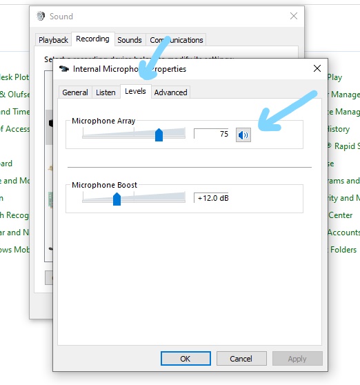 Click the Levels tab, look at the little microphone and click it once to unmute it, it will have a red circle if it's muted and normal mic look when unmuted. Hit the apply and ok button, then exit.