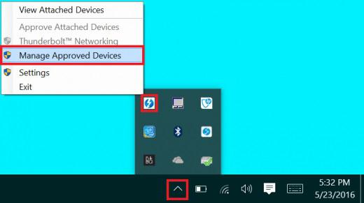 To view and manage the approved devices you can find the program sitting in the system tray. You may need to click the caret (up arrow icon) to show all of the running programs then right click on the Thunderbolt icon it and select Manage Approved Devices: