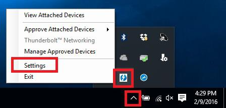 Once open you can find the program sitting in the system tray. You may need to click the caret (up arrow icon) to show all of the running programs then right click on the Thunderbolt icon and select Settings: