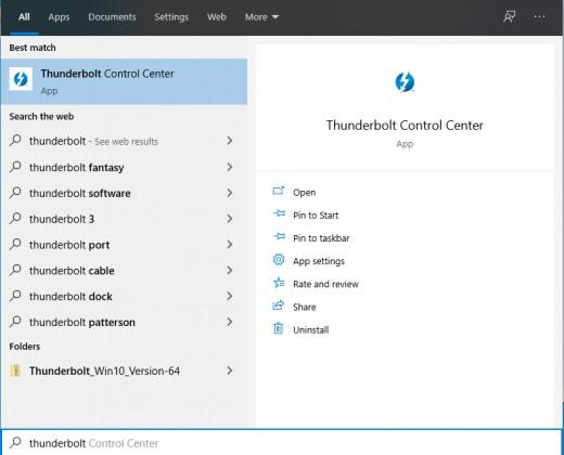 For systems running the DCH version of the Thunderbolt 3 drivers and the Windows Store Thunderbolt Control Center app, many newer hosts will automatically authenticate the attached device using secure connect. For systems where your attached Thunderbolt 3 device is not authenticated automatically via secure connect you can authenticate the device manually. Start by searching the start menu for Thunderbolt and selecting the Thunderbolt Control Center: