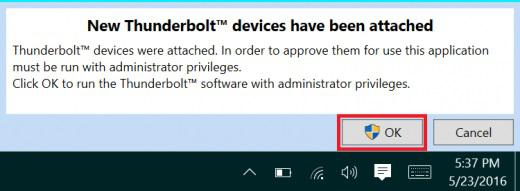 When first connecting a Thunderbolt 3 device to a Windows system, the device must first be authenticated through Intel’s Thunderbolt 3 software. After connecting a Thunderbolt 3 device the first thing that you should see (assuming that the system NVM, UEFI BIOS, drivers, etc are up to date and compatible) is an automatic notification above the system tray notifying you that a new device has been attached. You will want to click OK: