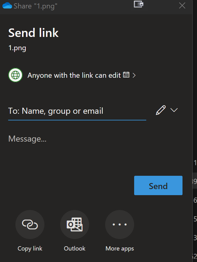 Now you can fill in an email to share it with, along with a brief message and hit send. Hit copy link to merely copy the link for pasting into another email or document, or click the Outlook button to have it start a new email with the link for you.