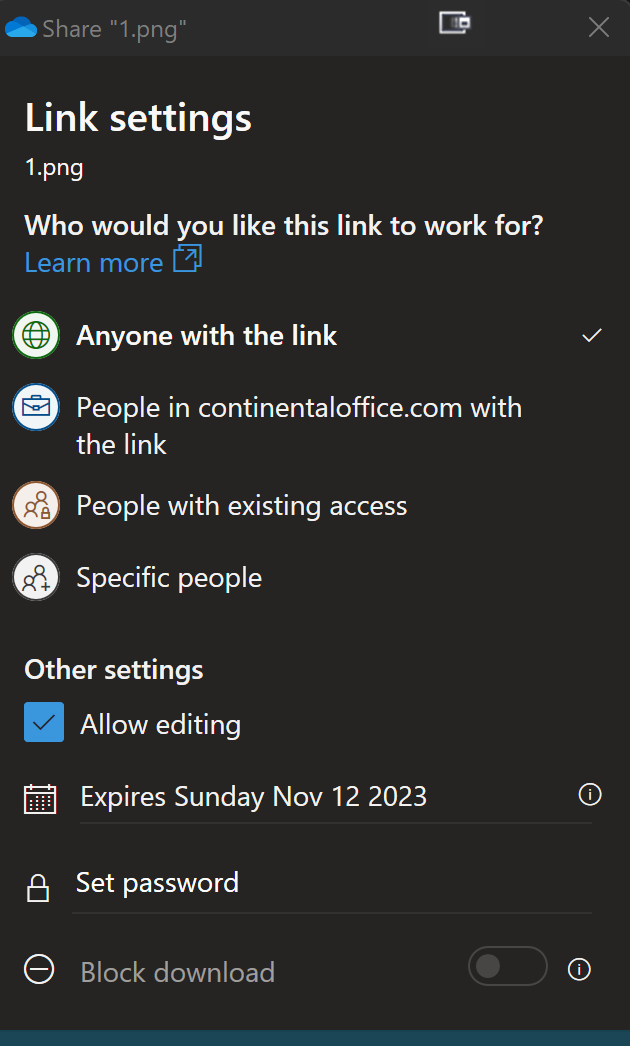 Now as you choose the level of access, the options will change. If you do "anyone with the link" you can also choose to set a password as well as allow editing, or set an expiration (by default the longest we can share something with the anyone with the link option is 720 days). But if you choose "only people in continentaloffice.com or specific people your only choice is to allow editing.