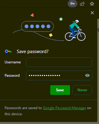 DO NOT SAVE THIS IN CHROME, THAT WILL NEGATE THE SECURITY OF THE MASTER PASSWORD. CHOOSE NEVER.