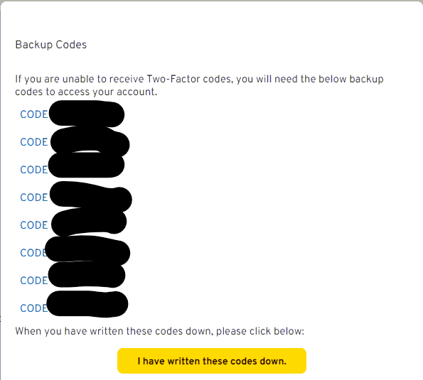 Once verified you will see 10 backup codes displayed