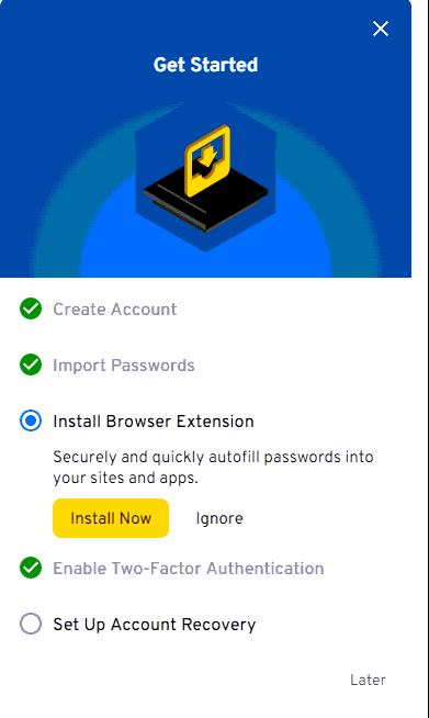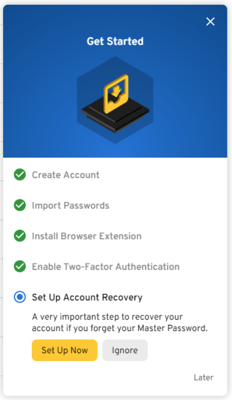 Lastly, it will offer you the ability to set up account recovery in the event you ever forget your Master Password. As these accounts are managed at the Enterprise level it is not required to do this step but you can if you wish.