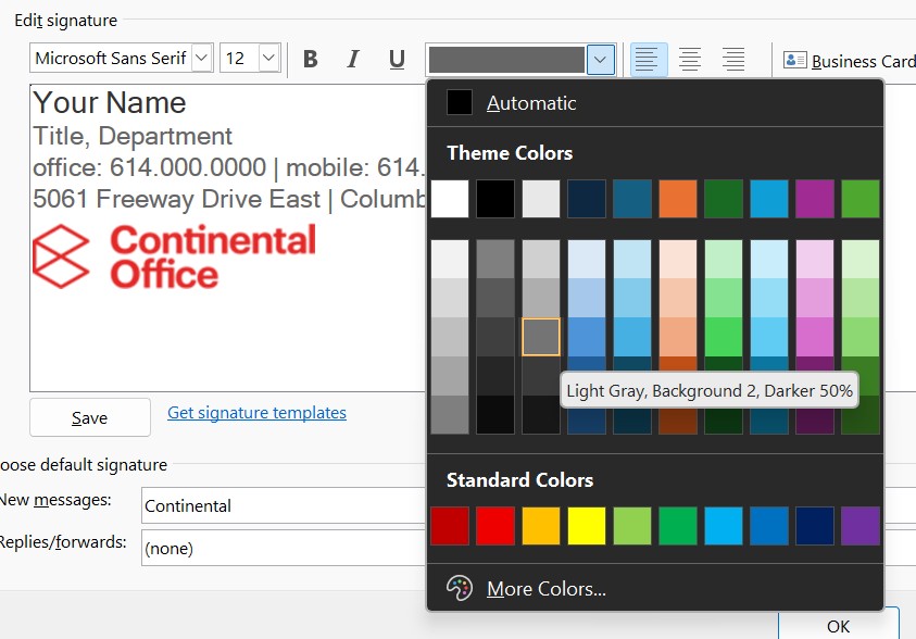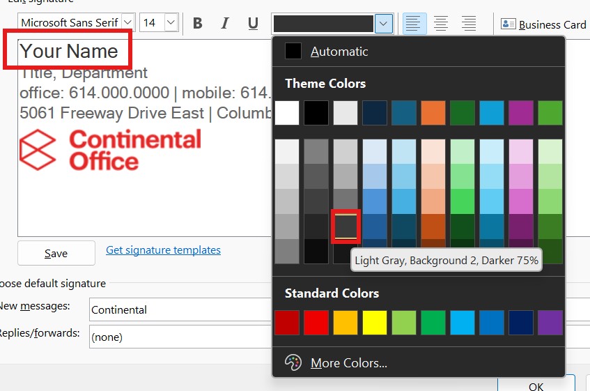 Now we'll set the font color by clicking on the "A" icon in the tool bar. The color to use is "Light Gray, Background 2 Darker 75%" which is highlighted in the image below.