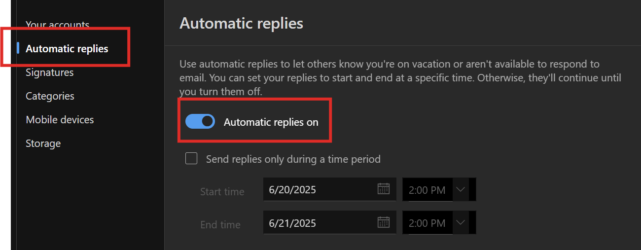 Now you can specify a time period if you wish. Additionally you can set one message for internal users and a different one for external. You can also set it just for one or the other.